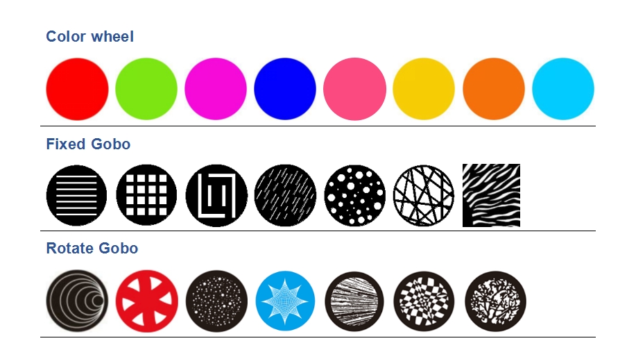 l1 Rotate gob wheel with 7 interchangeable glass gobo + white circle;