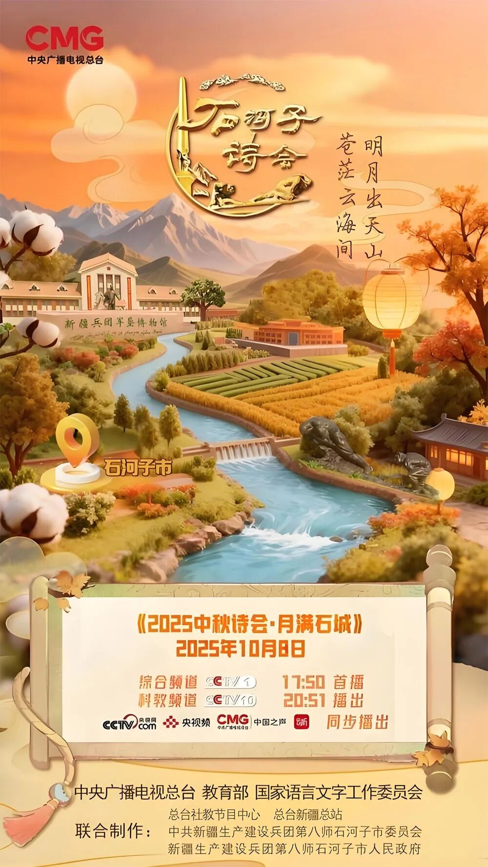 《2025中秋诗会·石河子诗会》由中央广播电视总台与八师石河子市联合打造,以“主题化策划铸魂、时代化赋能增效、群众化传播润心”为主线,深挖军垦文化的精神内核与诗词文化的永恒魅力。