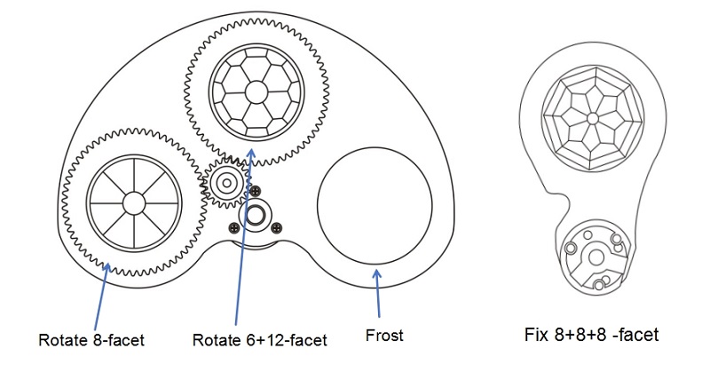one rotating 8-facet prism + 6+12-facet prism + frost;